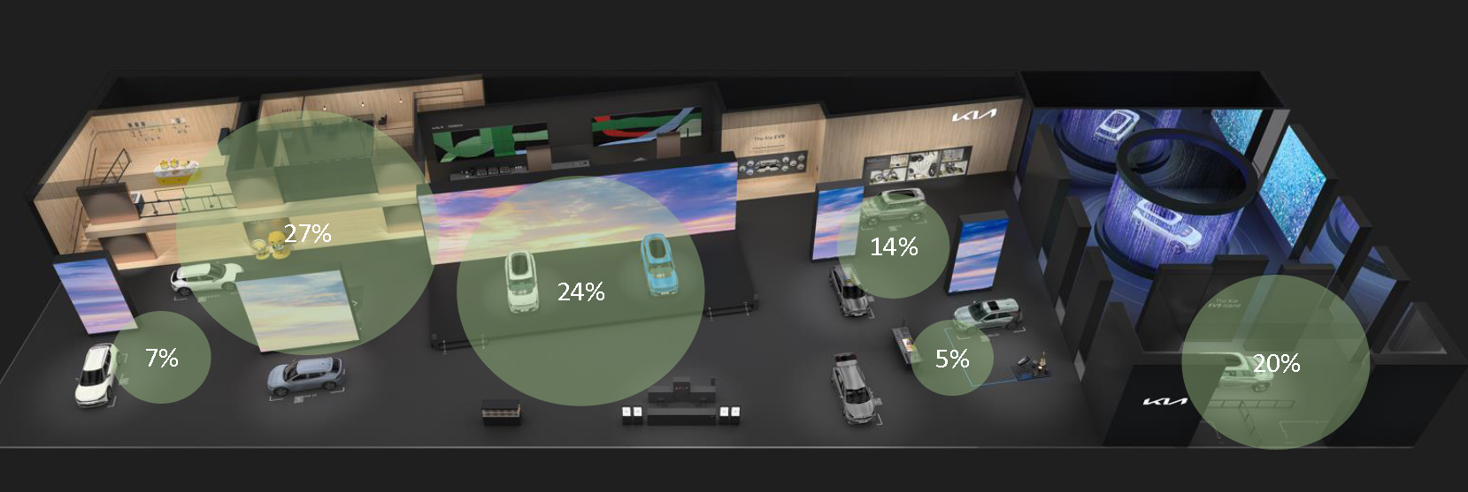 모터쇼에 방문하는 방문객들의 동선과 각 구역 별 체류 비율 등의 데이터를 추출하고, 방문객의 관심도에 대한 인사이트를 이끌어 냅니다.